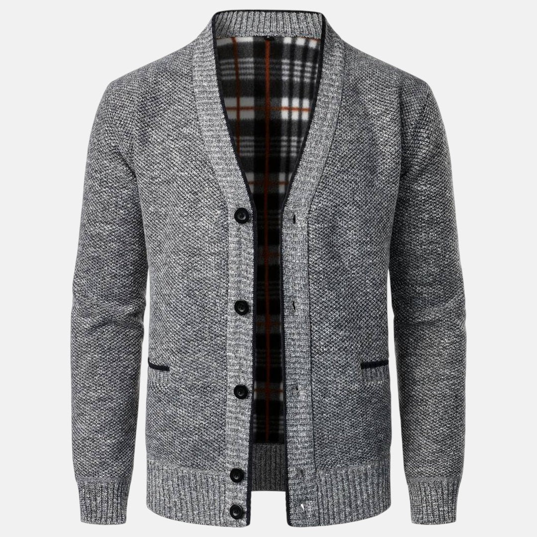 Oplev den klassiske varme fra strik med stil. Denne Knap Cardigan med V-Hals til Mænd har et ternet foer og sidelommer, der fusionerer raffineret håndværk med en moderne silhuet, ideel til at bevæge sig fra kontoret til weekenden med elegance.